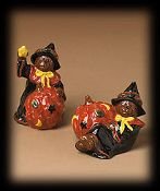High glaze salt and pepper shaker set. 3 3/4″W x 2 1/2″H (pepper); 3 3/4″H (salt). Part of Bruin Up Trouble collection 2004. (86623)