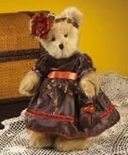 Dress features shimmering brown satin and velour with delicate golden vine embroidered accents. Burnt orange satin and velvety ribbon line her waistband and trim. Wears a matching satin headbandand ...