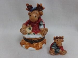 3 1/2″H hinged porcelain box with a mini friend (1 1/4″H) inside. Issued 1999. The Eco Moose. (392015)