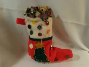 Brown bear climbing tree to put lights on. Clear lights. Gold & white ribbon. 12″H x 8 1/2″W.