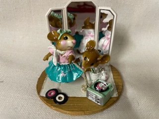 Part of series issued in 2006. Mother mouse is helping her daughter get ready for the dance. Originally painted in 6 different color combos. This is turq & white. (LTD-10B) 1950’s