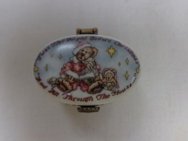 1 1/2″H x 2″W. Issued 1999. The Night Before Christmas. Inside lid says “…not even a mouse!” Porcelain. Editioned on the bottom.