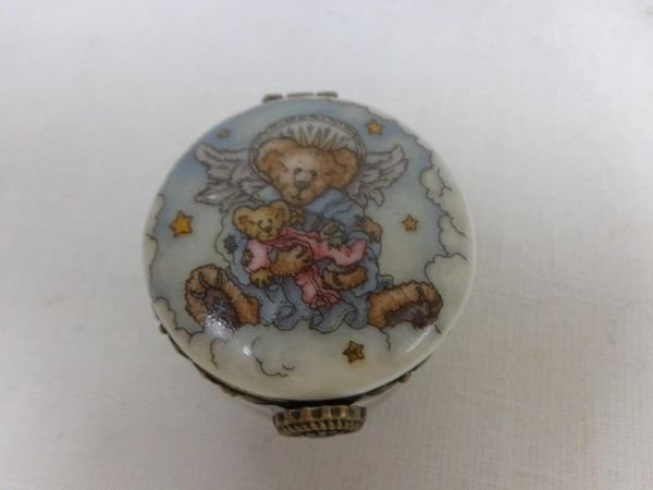 1 1/4″H x 1 1/2″W. Issued 1999. The Guardian. Inside lid says “Angels can fly because they take themselves lightly”. Porcelain. Editioned on bottom. (392095)