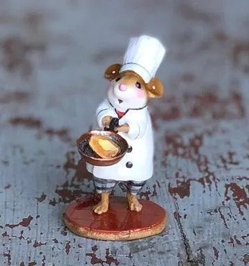 The master chef is in the zone whipping up a delicious meal. The pants are hand painted plaid with extreme detail and if you look closely in the tiny copper skillet you can see what’s sizzling away! Sculpted by Bonnie. 1.875 x 1″. Issued right after Halloween/Fall 2018.