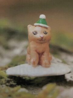 .75 x .75″. Issued for Christmas 2025, Limited until 11/15/2025. Mini kitty with green stocking hat.