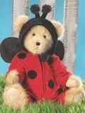 Zippered lady bug costume features soft red velourm, whip stitched black felt wings and antennae atop her black hood. 16″H. Large heavy bear. Like holding a baby! Part of the Bugglesworth Collection 2009. One left. (4015458)