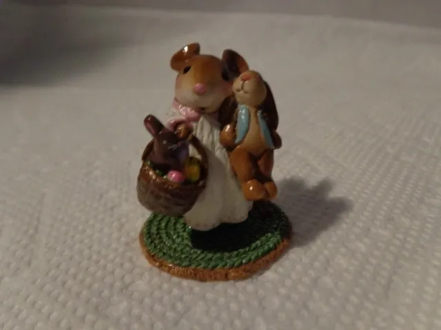 1″ x 1 1/4″. What a happy face on this little mouse. After waking on Easter morning she finds a basket filled with Easter goodies. Sculpted by Willy. Greenish/brown basket. S/O