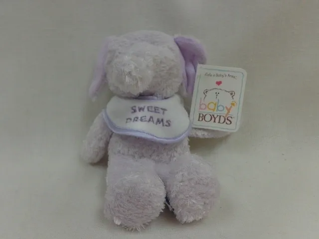 “Sweet Dreams”. Just the right size for newborns to hold tight and cuddle. 8″H. Removable bib. Rattle inside the tummy – just shake. Machine washable, low-heat tumble dry. Fully tested for baby’s safety with safety-lock eyes that baby can’t pull loose. Issued 2004.