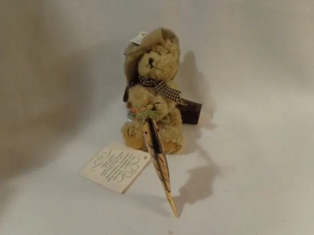 6 1/2″H sitting. He has a bucket of “worms”, is sitting on a log and has already caught a fish!!