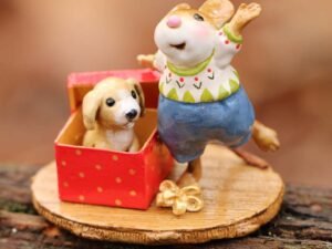 A color change for a long time favorite, a mousey holds up her freshly decorated gingerbread cookie to show what a sweet design she created. The tiniest holly leaves perfectly highlights her Christmas dress. 1.25 x 1″. Issued C’mas 2022. Allow 2-3 weeks.