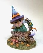 A game of hide and seek is sure to delight this bonny wee witch on a Halloween night. She searches high and searches low, looking for signs of a week ghostie’s glow. 1.75 x 1.5″. Sculpted by Donna. Issued Halloween 2022. Retired 2025.