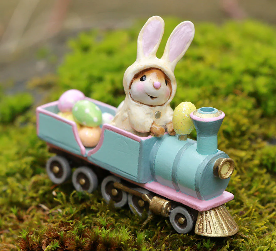 Here comes a mouse, dressed as the Easter bunny driving the Easter train, carrying pastel colored Easter eggs for all the joyful little mice waiting to have an egg hunt. Limited until 6/15/25. 1.75 x 2.25″. Issued for Easter 2025. As of 1’26 still available to order. Allow 2-3 weeks. (M-744b)