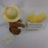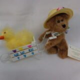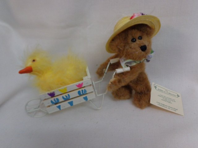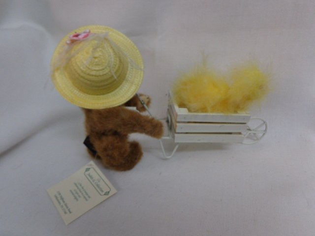 Bear pushing his duck friend in a wheelbarrow. 6 1/2″H x 11″W.
