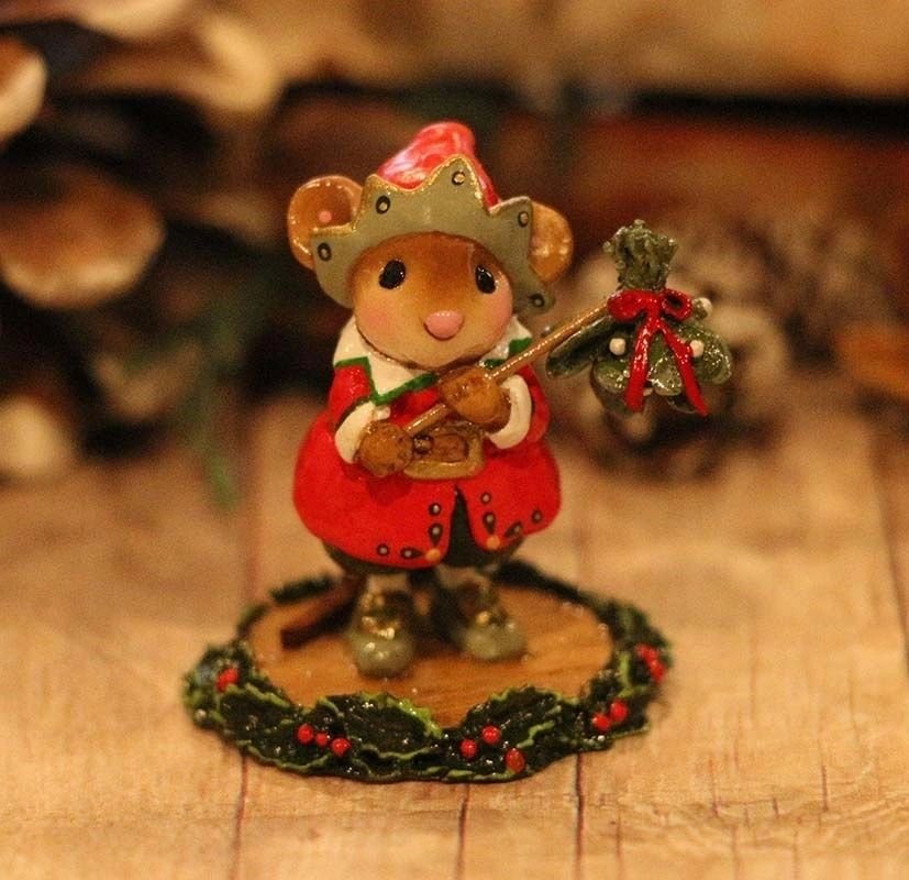 This wee elf mouse hopes to get a Christmas kiss with his bundle of mistletoe. His elf outfit is delicately designed with tiny Christmas designs. 1.5 x 1.25″. Sculpted by Willy. New for C’mas 2022. Retired 2025.