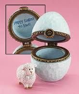 Wood chipped carved design hinged egg. Heartfelt and humorous sentiment sculted inside “Happy Easter to Ewe”. 2 1/4″H. Also available in pink with a yellow chick and lavender with a white bunny. See 293004-p (pink egg) and 293004-l (lavender egg). (293004)