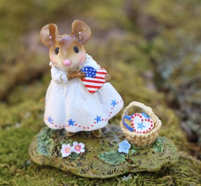 She is dressed in her detailed white patriotic dress and is holding her beautiful 4th of July decorations in support of the Land of the Free and the Home of the Brave! Limited to 9/1/2021. 1.5″ x 1.625″. Issued summer 2021. S/O
