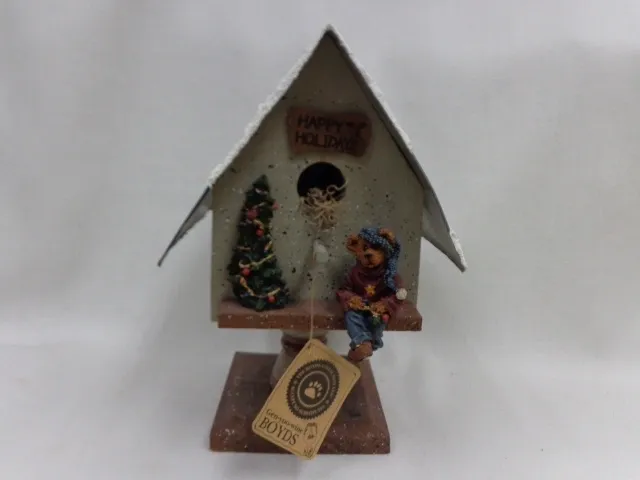 The Perfect Perch…This wooden birdhouse features a sculpted resin bear character, a folk art metal roof and a weathered finish. 11″H. (654404)