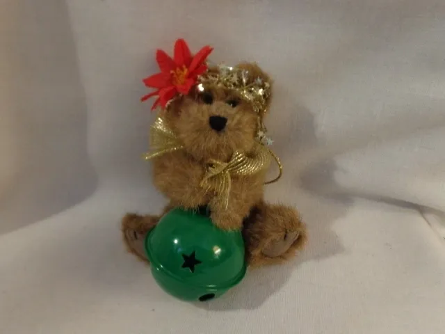 5 1/2″H sitting. She has a beautiful green bell that rings. Comes with a gold cord for hanging if desired.