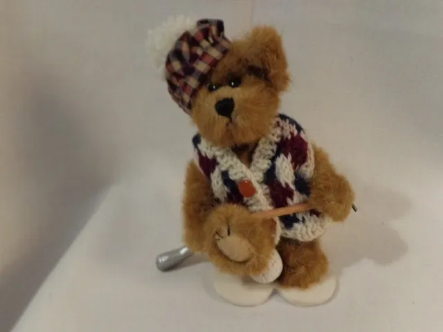 8″H. He wears a hand knit sweater. Looks like he’s broken his club.