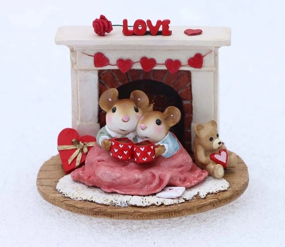 A warm fire glows behind this couple cuddling beneath a blanket during an unforgettable Valentine’s Day evening. Sculpted by Willy. 1.875 x 2.25″. New for Valentines Day 2023. Retired 2025.